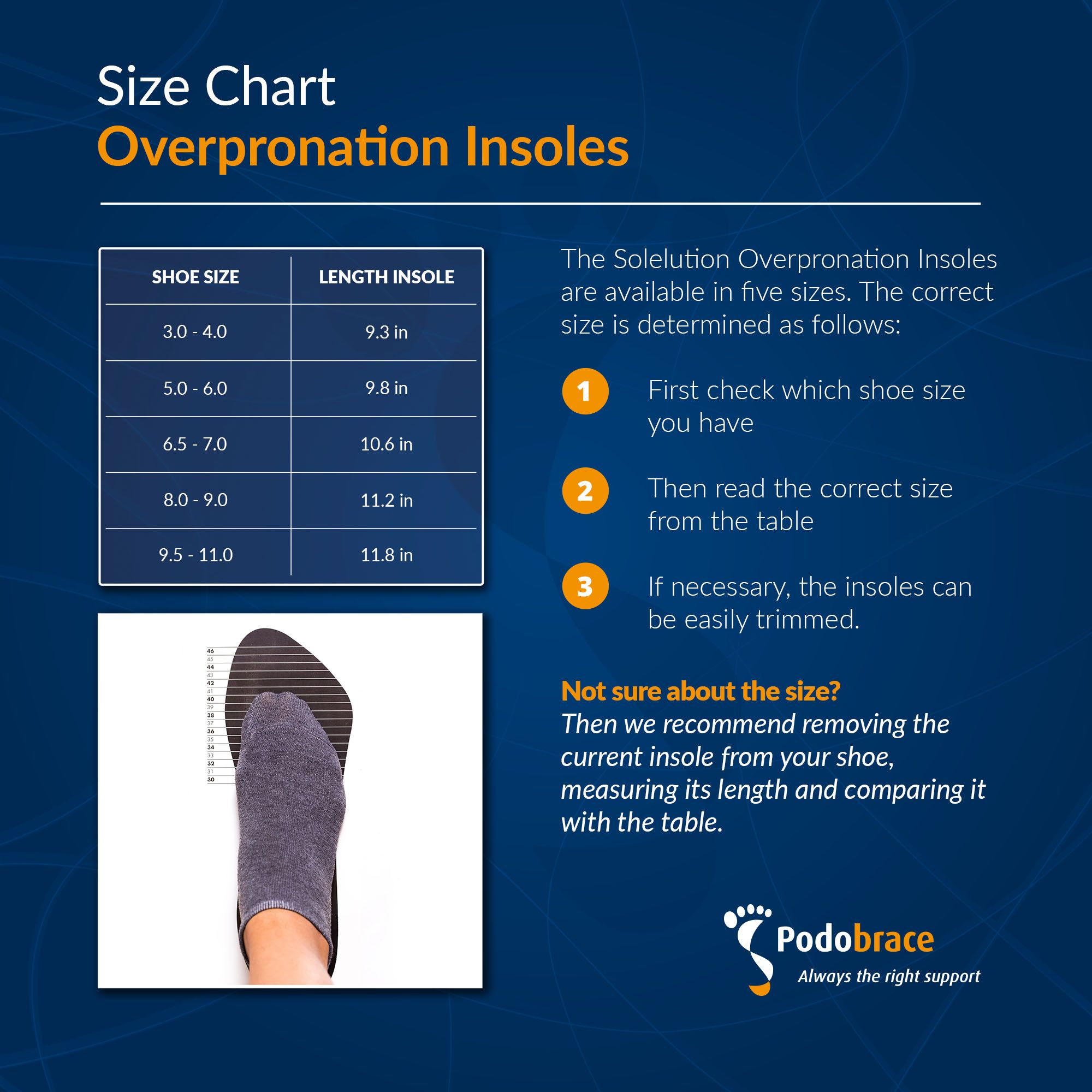 Solelution insoles are anatomically shaped and stay in place in almost any shoe. They are made of sturdy EVA with a breathable polyester top layer and feature a TPU rear foot support that provides extra stability. A proven choice for overpronation.